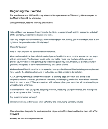Hello there! We hope you enjoy this exclusive team-building roleplaying exercise, developed by the White Pines Institute for the Fulfillment of Human Potential.